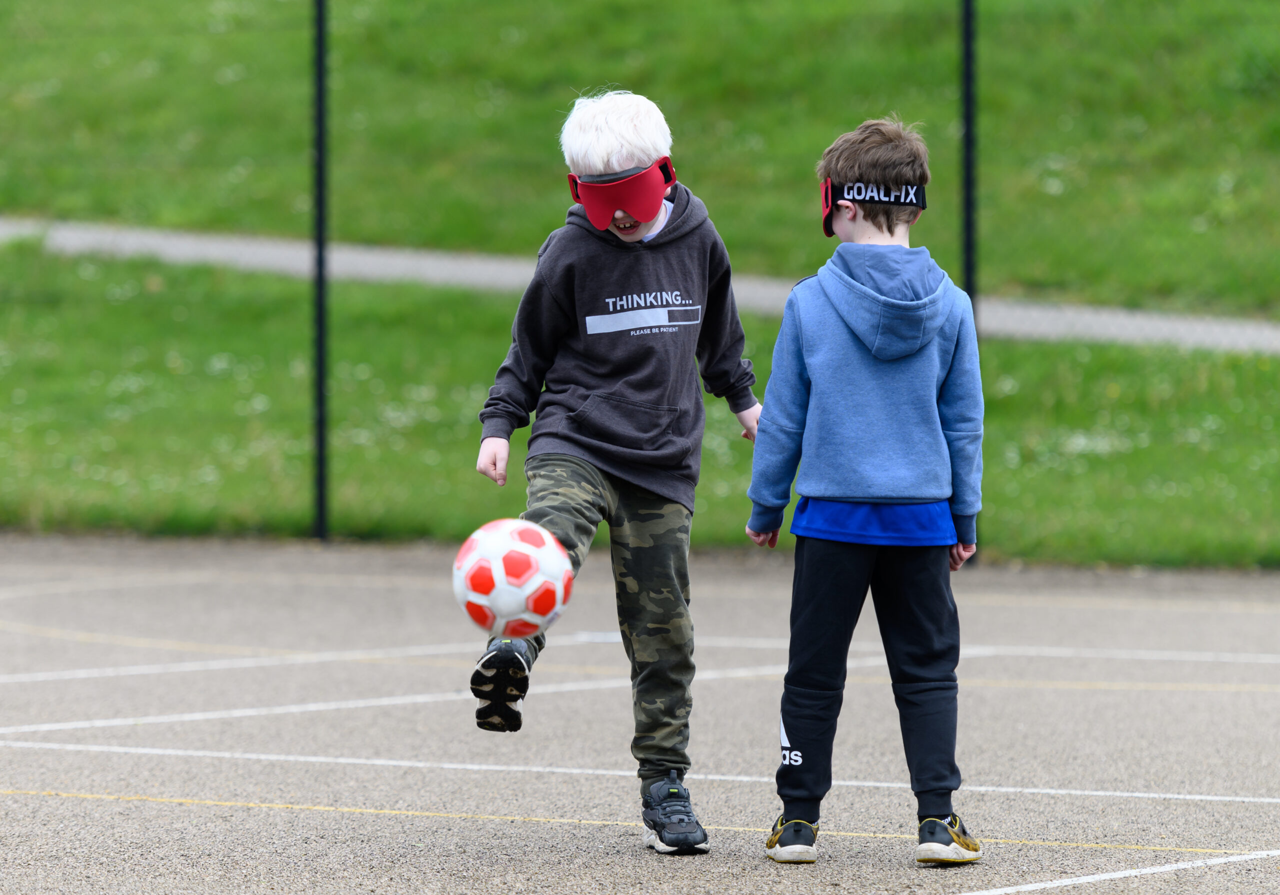 Two boys with visual impairments playing football.